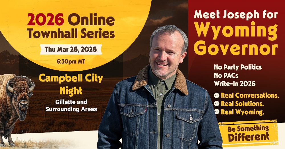 This isn’t about politicians talking at people — it’s about Wyoming talking with each other. Joseph is running as an unaffiliated write-in candidate for Governor in 2026, because real freedom doesn’t need permission. These townhalls give every community a voice, especially those who’ve been overlooked by party machines and political elites.