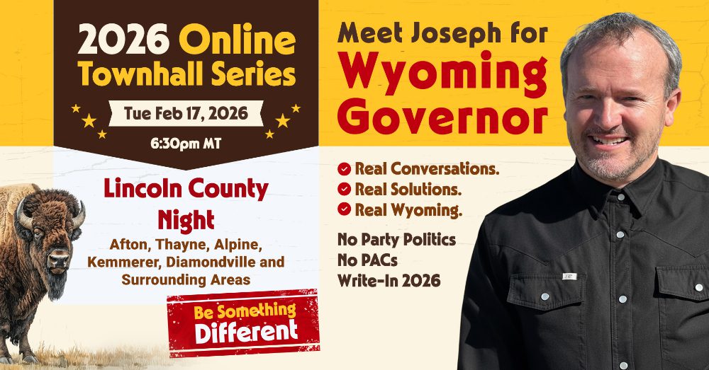 This isn’t about politicians talking at people — it’s about Wyoming talking with each other. Joseph is running as an unaffiliated write-in candidate for Governor in 2026, because real freedom doesn’t need permission. These townhalls give every community a voice, especially those who’ve been overlooked by party machines and political elites.